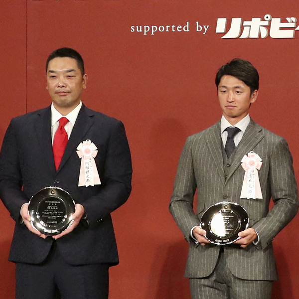 2019年NPBアワーズで隣り合った巨人・阿部監督(左)と阪神・近本光司(C)共同通信社