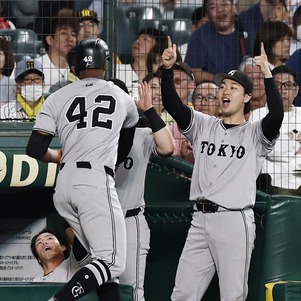 ヘルナンデスを迎える山﨑伊織(C)共同通信社
