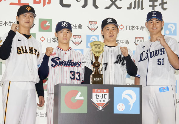 交流戦の記者会見で優勝トロフィーを前にポーズをとる(左から)巨人・田中瑛、ヤクルト・内山、ロッテ・鈴木、西武・西川(C)共同通信社