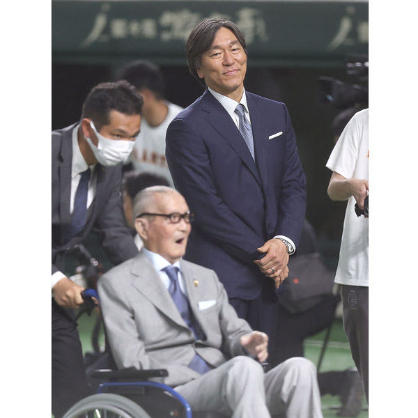 松井秀喜氏と巨人終身名誉監督の長嶋茂雄氏=2024年GW中のセレモニーで(C)日刊ゲンダイ