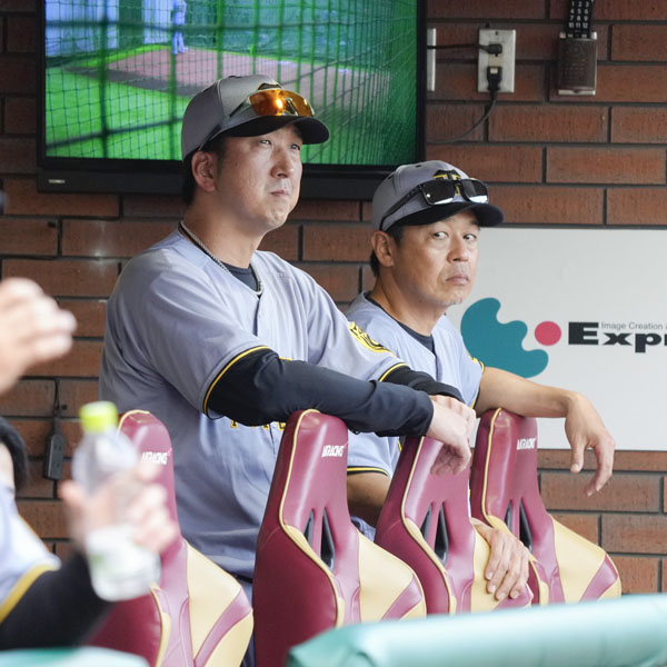 15日楽天戦、佐藤輝明の走塁に表情を曇らせる阪神・藤川監督(右は、藤本敦士コーチ)/(C)共同通信社
