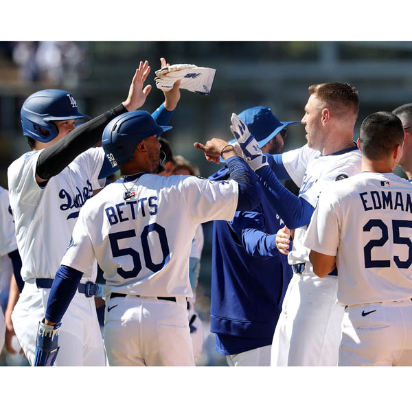 フリーマン(右2)やベッツらとハイタッチする大谷翔平(C)ロイター/Imagn Images