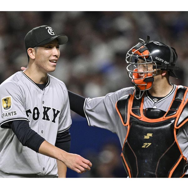 岸田(右)とのコンビで3勝を挙げた戸郷(C)共同通信社