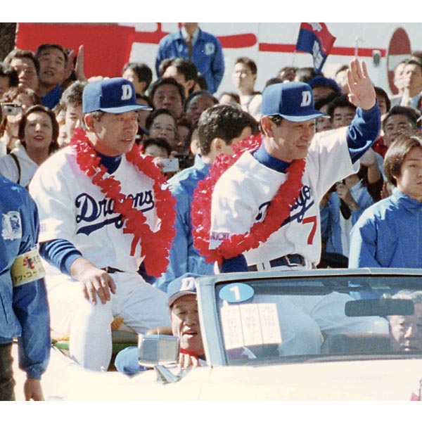 1999年優勝パレードでの星野仙一監督と鳥野育夫ヘッド(左)/(C)共同通信社