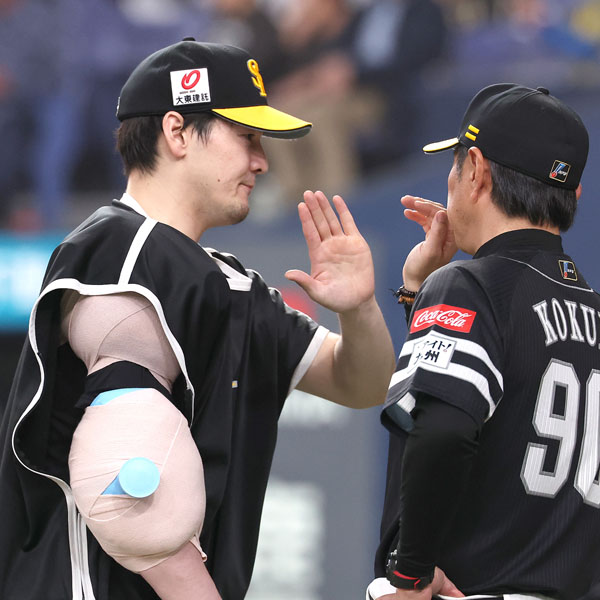 小久保監督(右)とハイタッチする有原航平(C)日刊ゲンダイ