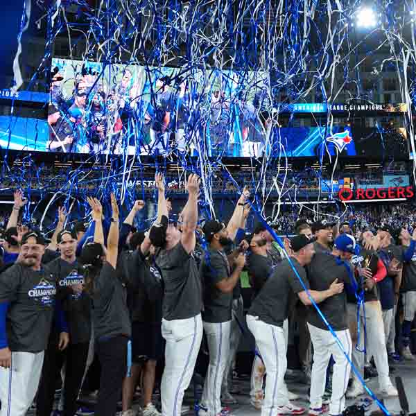 32年ぶりのワールドシリーズ進出を果たし歓喜のトロント・ブルージェイズのナイン(C)ロイター/Imagn Images