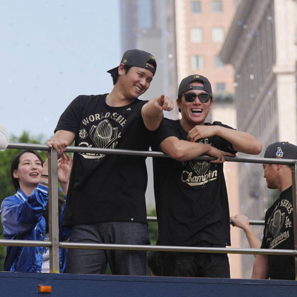 真美子夫人とともに優勝パレードする大谷翔平、右は山本由伸(C)ロイター/Imagn Images