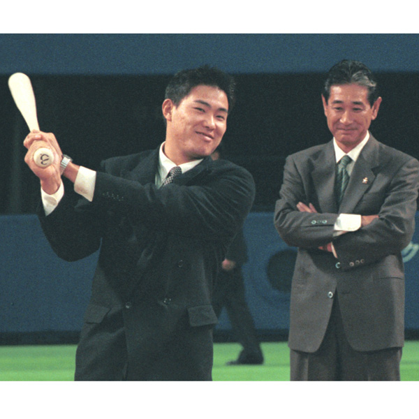 1998年ドラフトで中日を逆指名した福留孝介(右は星野仙一監督)/(C)共同通信社