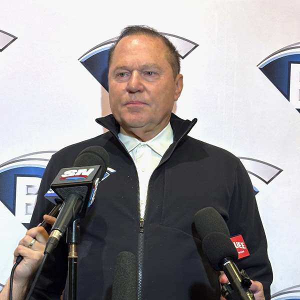 記者団に応じる今井達也の代理人ボラス氏(C)共同通信社