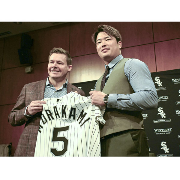 ホワイトソックスの入団会見をするクリス・ゲッツGM(左)と村上宗隆(C)ロイター/Imagn Images