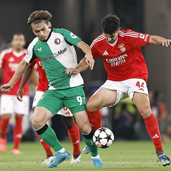 臀部と太ももでDFの動きを封じる(ベンフィカ戦で競り合う上田)/(C)共同通信社