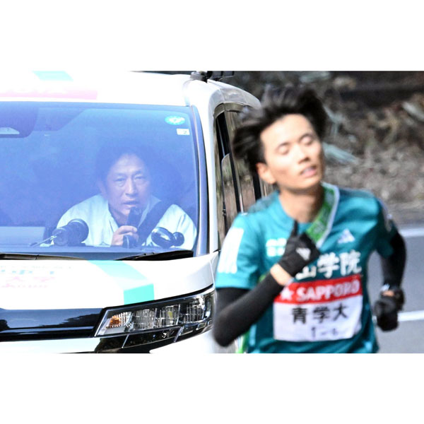 青学大5区の若林宏樹(手前)にマイクを使って声をかける原晋監督=2025年1月2日(代表撮影)