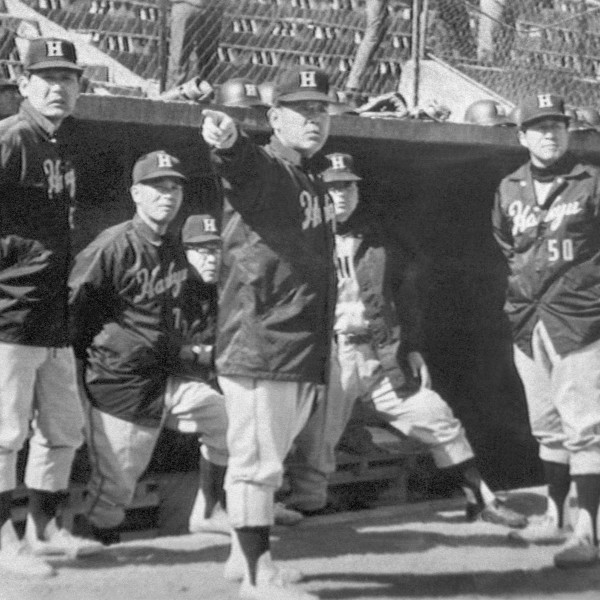 西本幸雄監督(右)はじめ、当時の阪急首脳陣(中央は青田昇ヘッド)共同通信社