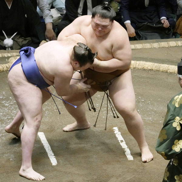 王鵬(右)に小手を決められる安青錦(C)共同通信社