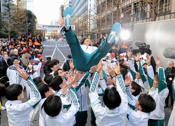 史上初となる2度目の総合3連覇を果たし、胴上げされる青学大の原晋監督(代表撮影)