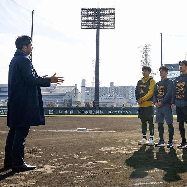 訓示する藤川監督(立石正広=右3)/(C)共同通信社