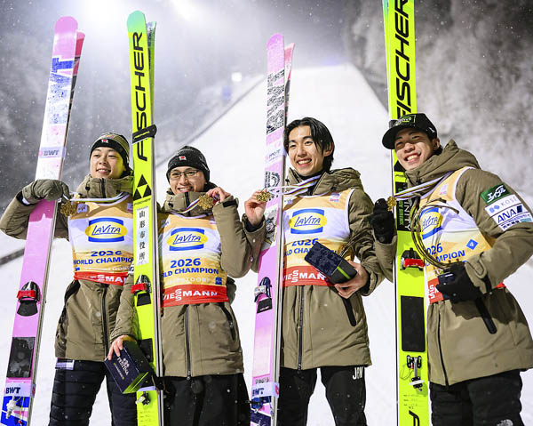 フライング世界選手権団体で初優勝を果たした日本(左から小林陵侑、内藤智文、中村直幹、二階堂蓮)/(C)ゲッティ=共同