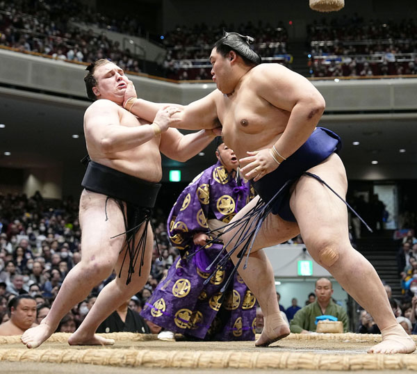 大の里(右)の攻めを受ける安青錦。押し倒しで敗れる(C)共同通信社