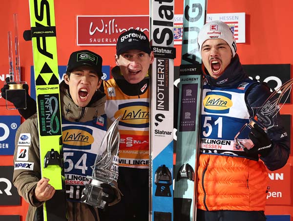 ノルディックスキーW杯ジャンプ、男子個人戦第20戦で2位の二階堂蓮(左)と優勝したドメン・プレブツ(=中央、右は3位フィリップ・ライムント)/(C)ロイター