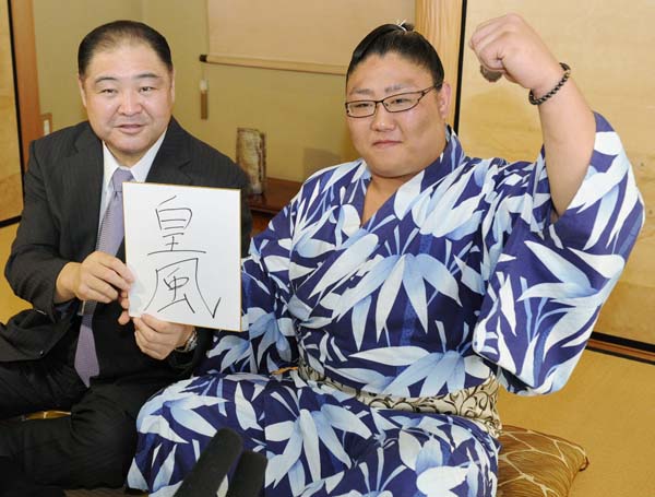 十両昇進で尾車親方と(2011年7月)/(C)共同通信社