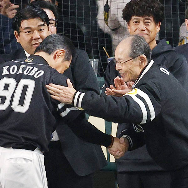ソフトバンクが2025年日本シリーズ優勝、小久保監督をねぎらう王貞治会長(右、その奥が城島健司CBO)/(C)共同通信社