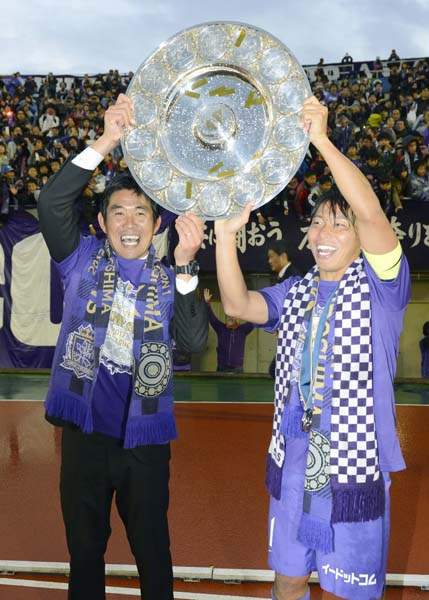 広島監督1年目の2012年にJ1制覇(右は元日本代表FW佐藤寿人)/(C)共同通信社(C)日刊ゲンダイ
