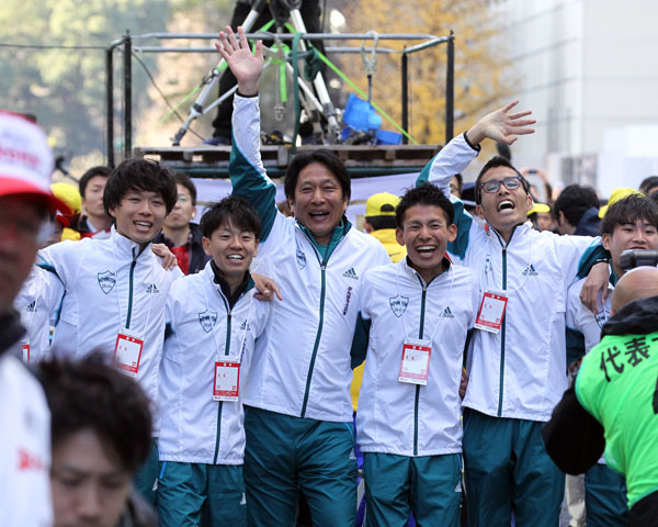 箱根駅伝でアンカーを迎える青学大メンバーと原監督(C)日刊ゲンダイ
