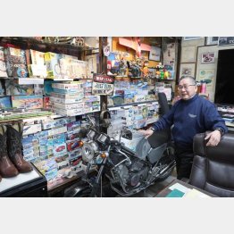 店の奥には、本物のオートバイが。「1982年型のホンダ250。350万円かけてカスタマイズした」との代物。ほかにも鉄道模型、レザークラフト、カメラ……。渡邉さんは「幼稚園のとき、サボテンを集めた」以来の収集癖あり。ご自身のコレクションずらりなのである。すべて非売品。同好の人たちが集まってくるそうだが、お金を生みませんよね?