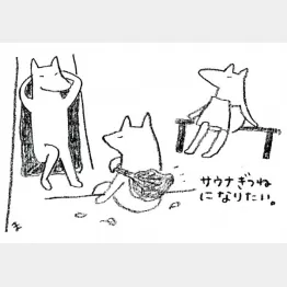絵の中で、裸のきつねはのっそりとサウナベンチに寝転がっている。あるときはスモークサウナの闇の中で両膝を抱えて座り、またあるときは湖のほとりでサウナ後のビールを飲んでいる。いつも目を細めて「いま」を味わうきつね。なんて愛おしいんだろう。