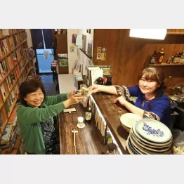 「面白いのはね、お客さんと物々交換……」と。例えば、買い取り希望の紙袋いっぱいの本をAさんが持ってくる。2000円で買い取り、支払う。Aさんが立ち飲み客となり、2000円を払って帰る。そうしたことがよくあるそう。いいなー! と言っているうちに、18時、開店時間を迎える。雨の月曜日にもかかわらず、10分もしないうちに10人が来店。「本買うだけ」「酒飲むだけ」どちらもOKだが、この日のお客に飲まない人はいず、ちょいと私もご一緒させていただいた。