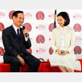 27日、農林水産省で開かれた「食と観光との連携による地域食材魅力発信事業」記者会見に、木村佳乃(38)と西川公也農林水産相(71)が出席した。