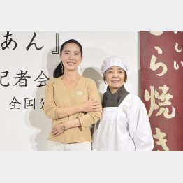 白装束ならぬ、白い割烹着姿で登場した。11日、主演映画「あん」(来年6月公開)の製作発表会見に出席した樹木希林(71)。
