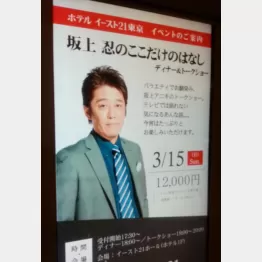 テレビで見ない日はないほど、今、もっとも旬な男。坂上忍、47歳。そんな彼がディナーショーをやるという。「坂上忍のここだけのはなし ディナー&トークショー」。なんとも興味をそそられるではないか。しかも料金は1万2000円(税込み)。ディナーショーとしてはリーズナブルだ。安かろう悪かろうという言葉もあるが、果たして中身はいかに。いざ「ホテルイースト21東京」へ――。