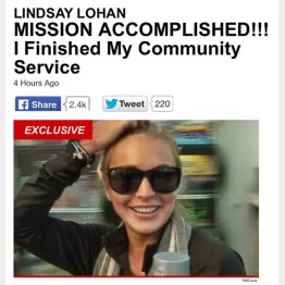 「任務達成! 社会奉仕活動を終わらせたよ」という見出しに、サングラスをかけた女性。彼女は「お騒がせ女優」として知られるリンジー・ローハン(28)。