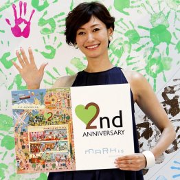 7日、「MARK IS みなとみらい開業周年記念イベント」に登場した田丸麻紀(36)。手形で描いたハンドアートの完成式に参加すると、「こういうのは小学校低学年以来かも。子供が大きくなったら、成長過程も見られると思うので、一緒にやってみたい」と話した。