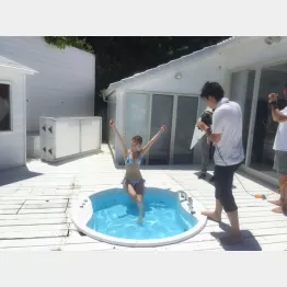 それは、小嶋が屋外に設置されたジャグジーの縁に腰掛けて両腕をYの字に伸ばしている姿を写したショット。のびのびとした雰囲気が印象的だが、よく見ると水に浸かっている両脚のうち、右脚のひざから下が消えてしまっているように見えるのだ。