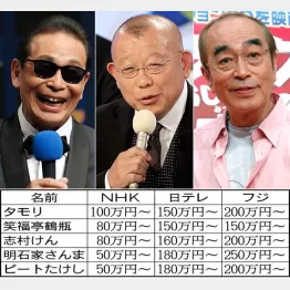 日刊ゲンダイが入手したギャラランキングを2回にわけて紹介しよう。まずは芸人のトップ5、明石家さんま、ビートたけし、タモリ、笑福亭鶴瓶、志村けんである。この5人をピックアップしたのはNHKの出演ギャラが高いからだ(金額はいずれも推定、参考までに日本テレビとフジテレビも)。