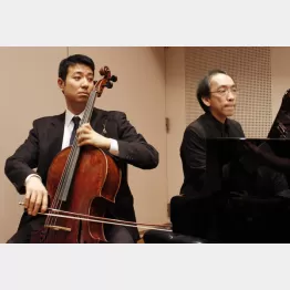 25日、作曲家の新垣隆氏(44)が音楽を手がけた映画「シロナガスクジラに捧げるバレエ」の完成発表会見が開かれ、共同作曲者のチェリスト・海野幹雄氏(39)とミニ演奏会を開いた。