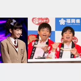 16日、「福岡よかもん市場・福岡よかとこ旅行券」記者発表会に出席したお笑いコンビ「博多華丸・大吉」。博多華丸(45)といえば、最近、次女がアイドルグループ「さくら学院」の岡崎百々子(12)であることが発覚したばかり。親子での共演について聞かれると、「全然。自宅だけです、共演は」と笑わせた。