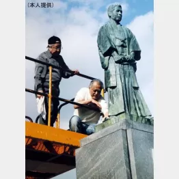 この写真を撮ったのは、京都の等持院境内。祖父・マキノ省三の銅像を兄貴(長門裕之)と2人で掃除をしているところです。高さが4、5メートルもあって大きいから、下から水をかけるのが大変でね。テレビ番組で企画してくれたおかげで、クレーンを使って頭から水をかけることができました。