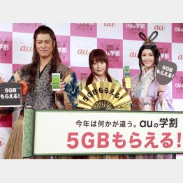 12日に開かれた「au発表会2016 Spring」に、CMで「かぐちゃん(かぐや姫)」役を演じる有村架純(22)、「乙ちゃん(乙姫)」役の菜々緒(27)らが登場した。