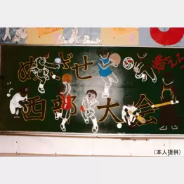 これは町立大須賀中学3年のとき、教室の後ろの黒板に水彩絵の具か何かで描いたものです。「全中大会」という中学対抗のスポーツ大会の地区予選のときに盛り上がり、クラスのみんなに「描いて」と言われて。クラスメートには“絵がうまい子”と思われていたので、毎年、大会の時期に描いていましたね。終わったら消してしまうし、写真なんてあんまり撮らないから、残っているのはこの一枚。ずっとスポーツ漫画を描いている私にとって原点のような一枚です。ひたすら楽しくて描いていたことを懐かしく思い出しますね。当時はバレー部に所属し、漫画ばかり描いてたわけじゃないですけど。