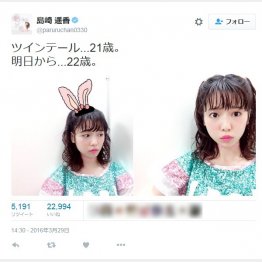3月30日が誕生日の島崎は「ツインテール...21歳。明日から...22歳」と自撮り写真2枚をアップ。ゆるくウェーブをかけた髪をツインテールにし、唇には鮮やかなピンクの口紅。キュートに口をすぼめるなど、かわいらしさを前面に押し出している。