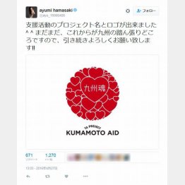 歌手の浜崎あゆみ(37)が27日午後、自身が行っている熊本地震被災地への支援活動プロジェクト名とロゴが決まったことをツイッターで発表した。