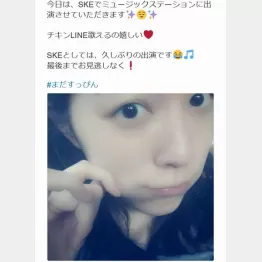 「今日は、SKEでミュージックステーションに出演させていただきます」と松井がアップしたのは、お茶目にほっぺをつまんだ自身の顔写真。ハッシュタグで「まだすっぴん」と明かしており、テレビ出演に向けて準備を進めている最中に撮影したもののようだ。