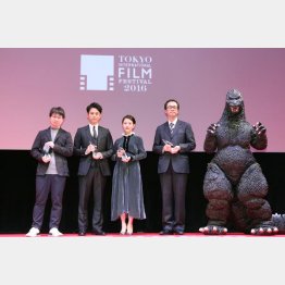 今年の“邦画界の顔”ともいうべき面々が選ばれた。3日の第29回東京国際映画祭のクロージングセレモニーで発表された、映画界に貢献している人たちを表彰する「ARIGATO(ありがとう)賞」に選ばれたのは「君の名は。」の新海監督ほか、妻夫木聡(35)、高畑充希(24)、そして「シン・ゴジラ」のゴジラ――。なかでも観客から最も歓声を浴びたのは、長い尾っぽを引きずりながら登場し、抜群の存在感を発揮したゴジラだった。