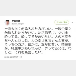 佐藤は11日付の自身のツイッター(写真=原文ママ)で息子に向け、一流大学や一流企業にはもちろん入れた方がいいとした上で、〈ただ息子よ。父いま酔ってる。酔ってるが言いたい。人の不幸をちゃんと悲しむ。人の幸せをちゃんと喜ぶ。そっちの方が、遥かに、遥かに尊い。綺麗事か。綺麗事かもしれんが、酔ってる父は、わりと、それを断言したい〉とつぶやいてみせた。