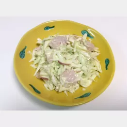 「キャベツの千切りと魚肉ソーセージ、リンゴを三角形に切ってマヨネーズで和えて味の素を少々入れたものです。これにもやっぱり砂糖を隠し味で入れるんです。砂糖を入れることによって味がまろやかになり、水気も出る。酸味のあるコールスローとは反対側にあるサラダでしょうね。キャベツのサラダにはハムを入れることの方が多いから、魚肉ソーセージも珍しいかも。リンゴはシャキシャキのまま、甘味もとてもいいです」
