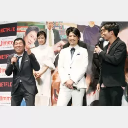 明石家さんま(63)が19日、都内で行われた自身が企画・プロデュースのNetflixオリジナルドラマ「Jimmy~アホみたいなホンマの話~」の完成披露試写会に登壇した。 若手時代のジミー大西とさんまとの深い絆を描いた今作は、当初、さんま役で小出恵介が出演する予定だった。しかし、小出が淫行騒動で降板。玉山鉄二が代役として出演している。 この日は6月に玉木宏と結婚した木南晴夏も結婚後初めて公の場に出席。さんまから「彼(玉木)はオレたちとどこが違う?」と聞かれ、「顔」と答えて爆笑に包まれていた。