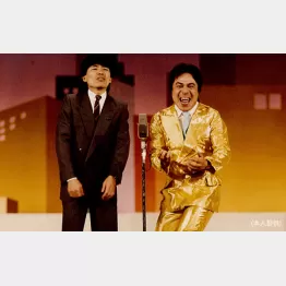 この写真は「花王名人劇場」(関西テレビ・フジテレビ系)に出演した時のものですわ。着ているスーツが金ピカのピッカピカ、えらい地味でしょ?(笑い)。僕らが漫才ブームで人気に火がついた少し後ぐらい、82年とか83年あたりやと思います。衣装は番組で「コンビのどちらかが変わった衣装を着る」という企画があって、制作スタッフさんが用意してくれたんですよ。特注も特注、この世でたったひとつだけ。忘れようにも忘れません。